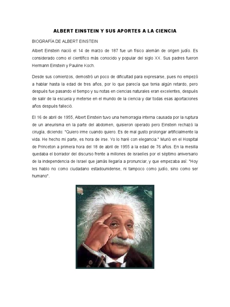 Biografia de albert einstein resumen para nios. Hola aqu les dejo esta biografa de Albert Einstein para nios espero les guste y la compartan saludosSgueme en mis redes sociales. Su madre que saba tocar diversos instrumentos musicales inspira la pasin musical que Einstein demostr desde muy pequeo. Fue el primognito de Hermann Einstein y Pauline Koch.