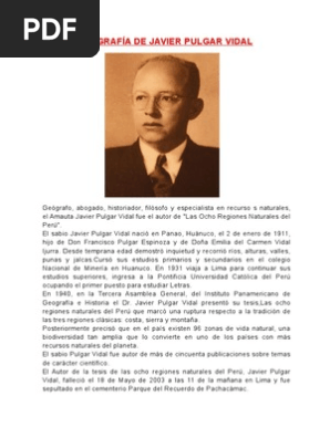 Las Ocho Regiones Naturales del Per la que se. Seit seiner Kindheit interessierte er sich fr Geographie da er durch die stndigen Reisen seiner Familie verschiedene Landschaften sehen konnte. Naci en Panao Hunuco Per el 2 de enero de 1911 hijo de Francisco Pulgar Espinoza y de Eumelia del Carmen Vidal.
